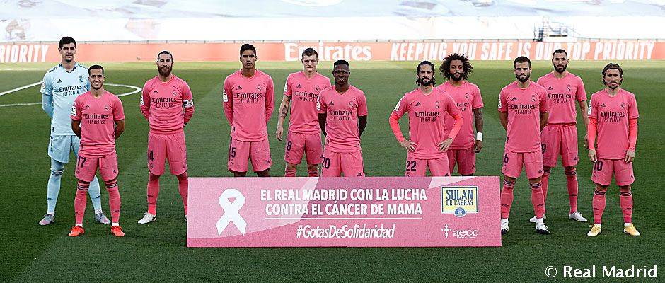 皇马将在与加的斯的比赛中身穿第二客场的粉色球衣出战,而不是主场传统的白色球衣。此举是为了声援世界乳腺癌防治月。