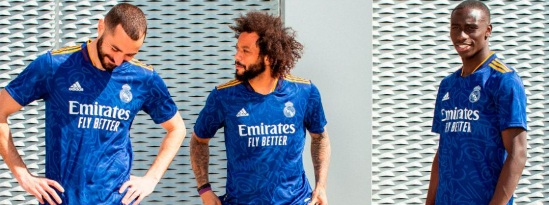 皇家马德里与阿迪达斯一同发布了俱乐部2021/22赛季客场球衣。客场球衣以深蓝色为主色调,并结合橙色的领口与阿迪达斯经典的三道纹设计,赞助商和球队队徽采用了白色的主色。球衣灵感来自于现代艺术,融合了马德里城市建筑的框架元素。