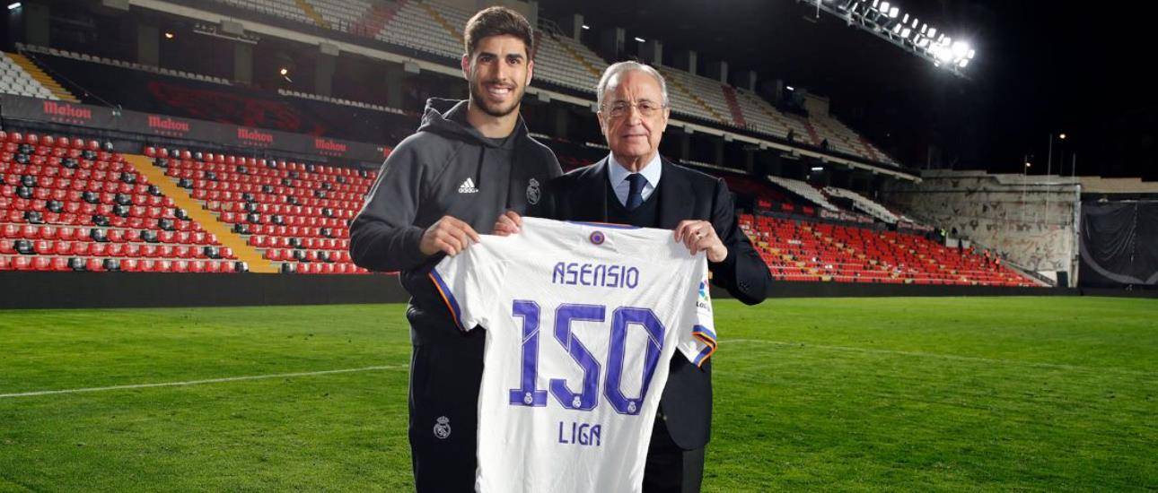 阿森西奥完成皇马生涯第150场西甲联赛本轮西甲,皇马在客场1-0击败巴列卡诺,首发出战的阿森西奥迎来个人皇马生涯第150场西甲联赛,这也是他白衣生涯各项赛事的第100场胜利。赛后,皇马主席弗洛伦蒂诺为他送上了纪念球衣。目前是阿森西奥效力皇马的第6个赛季,他分别在2017年和2020年跟随皇马赢得西甲冠军。