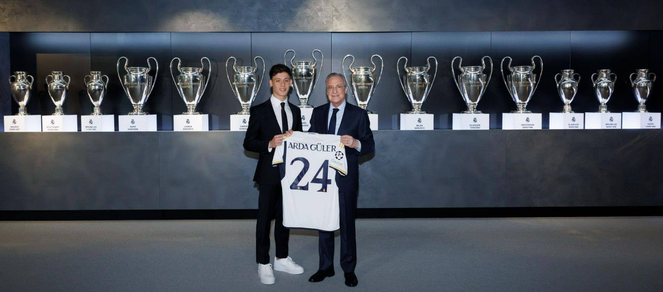 在皇马荣誉室中,阿尔达·居莱尔从主席弗洛伦蒂诺先生手中接过了属于他的24号球衣。