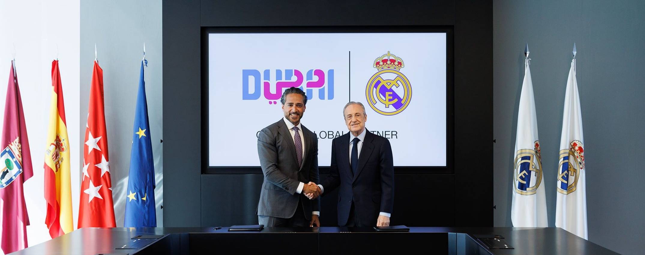 皇马与迪拜旅游局达成全球性合作协议皇家马德里与迪拜旅游局达成全球合作协议,该协议旨在为双方创造新的合作机会,并将阿联酋迪拜市设为皇马首个官方旅游目的地。这一活动在皇马体育城的会议室举行,由皇马主席弗洛伦蒂诺·佩雷斯和迪拜旅游营销与商务公司(DCTCM)首席执行官伊萨姆·卡兹姆主持。