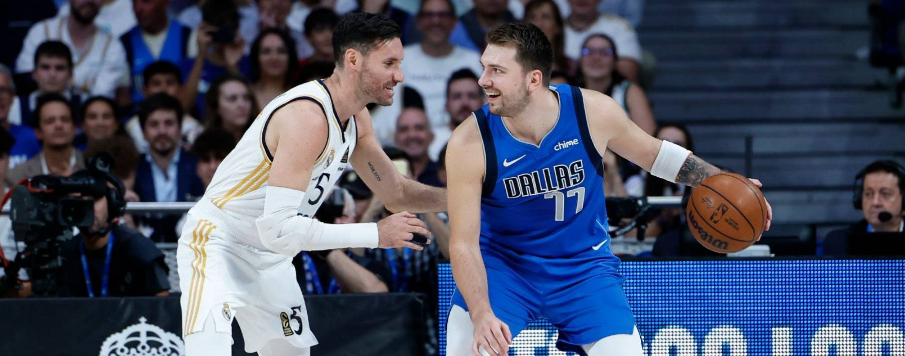 比赛一开始,柳利和东契奇就上演了精彩的一对一三分球。我们的队长手感火热,四罚三中,但他因为肌肉问题在场上只待了 4 分 59 秒。两队在第一节都展开了猛烈的进攻。皇马男篮投进了多达 8 个三分球(坎帕佐、鲁迪和海佐尼亚),达拉斯独行侠也投进了 7 个三分球。凭借波瓦里埃在内线的强势表现和外线的火热手感,我们暂时领先。