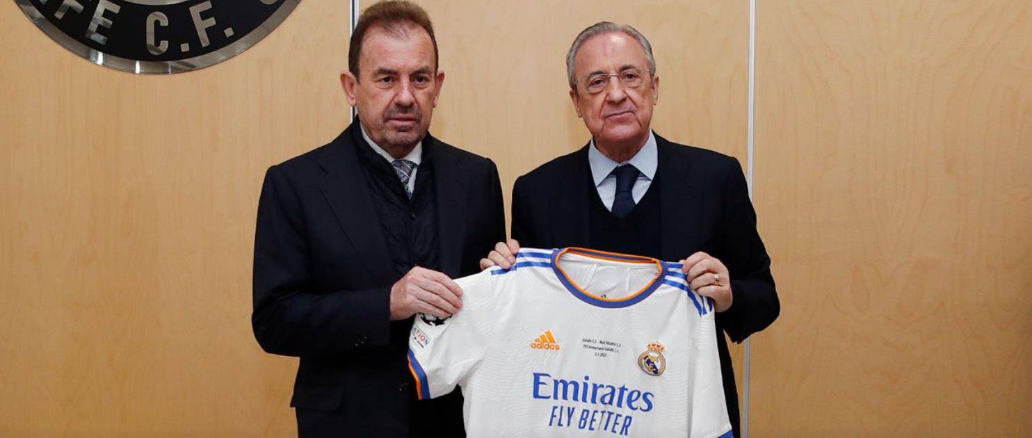 在昨晚皇马与赫塔费的西甲比赛中场休息时,皇马主席弗洛伦蒂诺与赫塔费主席安赫尔·托雷斯进行了礼物交换仪式,以此来纪念赫塔费建队的第75周年。