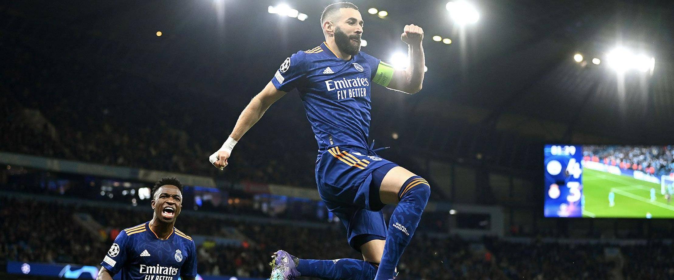 欧冠半决赛首回合在今晨开打,皇马凭借本泽马的梅开二度和威尼修斯的进球,最终客场3-4憾负曼城。本场比赛第2分钟,B席助攻德布劳内头球破门,皇马客场0-1落后曼城。第11分钟,热苏斯破门,皇马客场0-2落后。第18分钟,莫德里奇前场断球,本泽马接球后送出斜塞,威尼修斯领球内切小角度攻门打偏。第30分钟,皇马开出战术角球,本泽马左路传中,阿拉巴头球攻门稍稍偏出。第33分钟,莫德里奇中圈附近做出抢断,门迪左路接球斜传禁区,本泽马不停球直接打门得手,皇马扳回一城,比分被改写为1-2。第35分钟,克罗斯中场精准斜长传转移,卡瓦哈尔右路下底回做,罗德里戈前插打门被扑。