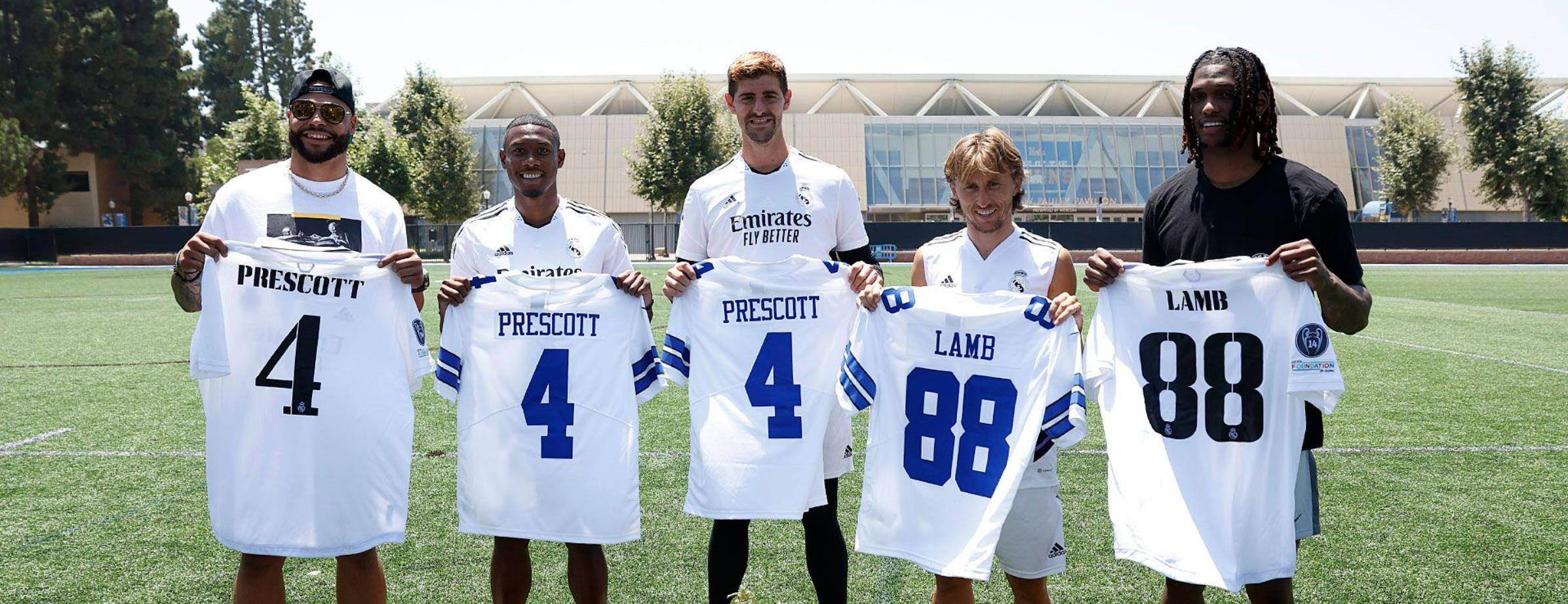 NFL达拉斯牛仔队球员达克·普雷斯克和希迪·兰姆近日拜访了皇马在UCLA的训练基地,期间他们与皇马队员进行了友好互动,并与莫德里奇、阿拉巴、库尔图瓦互换了球衣。