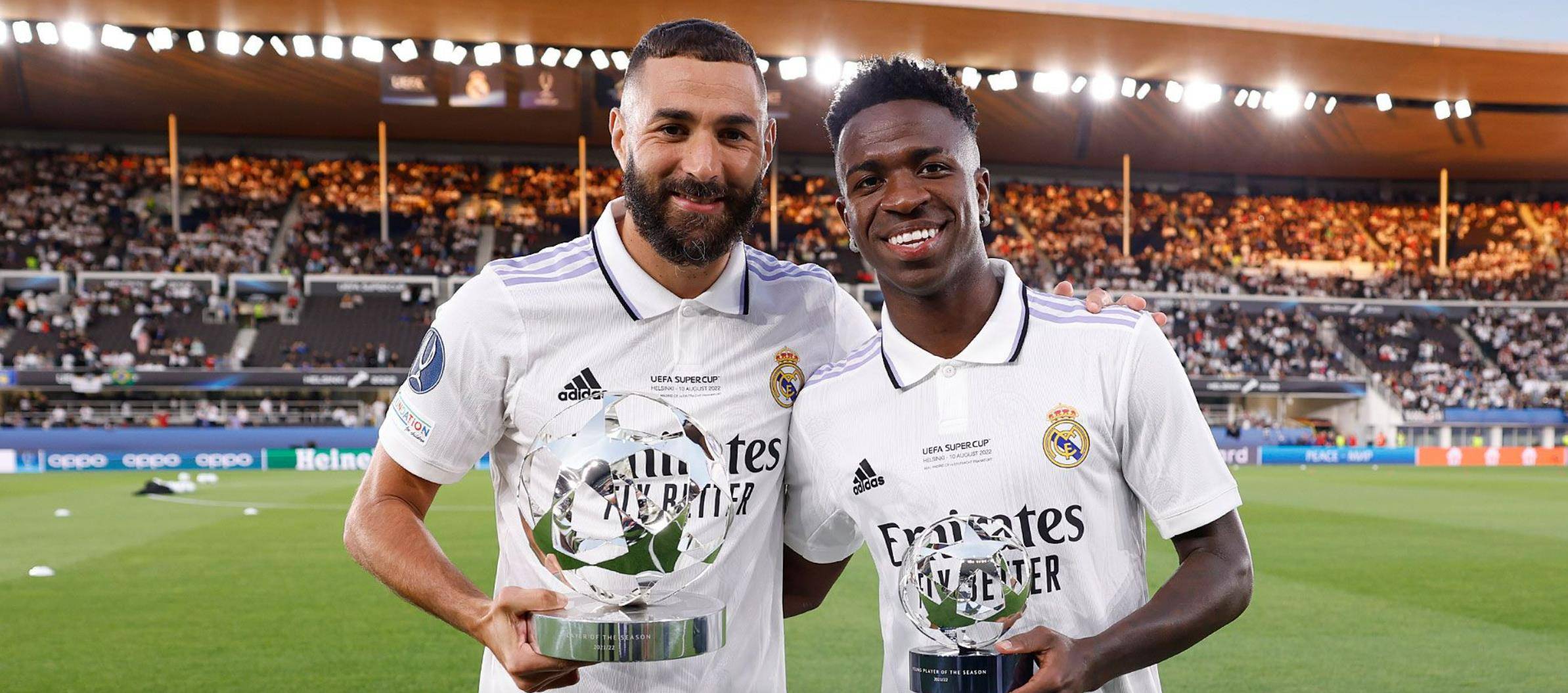 本泽马和威尼修斯在欧洲超级杯开赛前领取了上届欧洲冠军联赛的个人奖项。本泽马在2021/22赛季欧冠中被选为最佳球员。法国人在他参加的12场比赛中打进了15粒进球,在赢下第十四冠中起到决定性作用。此外,本泽马还夺得了上赛季的欧冠金靴,他在对阵巴黎圣日耳曼和切尔西的比赛中上演了精彩的帽子戏法。