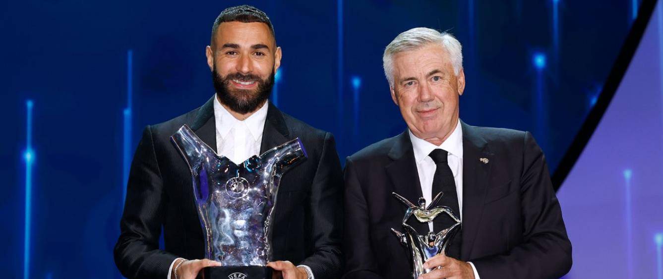 在刚刚结束的欧足联颁奖典礼中,皇马前锋本泽马夺得年度最佳球员,主帅安切洛蒂夺得年度最佳教练。本泽马在上个赛季各项赛事打入44球,并夺得了西甲冠军、西超杯冠军、欧冠冠军和欧超杯冠军。此外,他还是西甲和欧冠的双料金靴获得者。