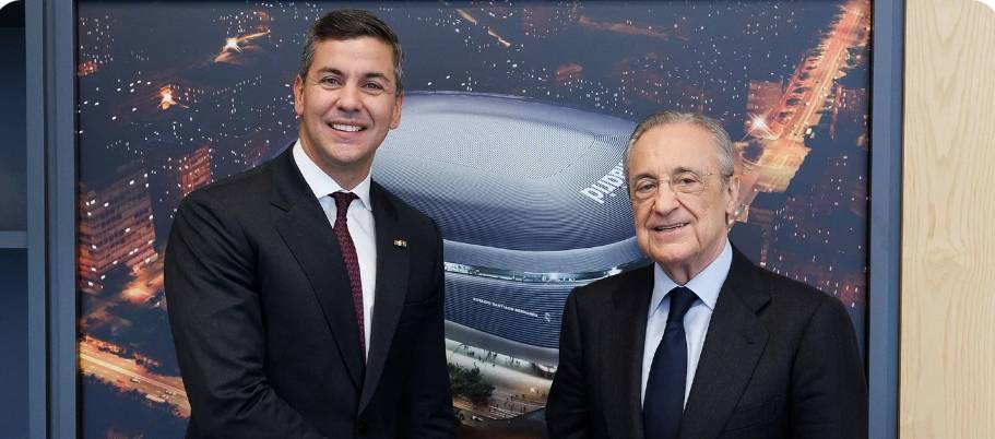 巴拉圭总统圣地亚哥·佩尼亚近日访问了皇马体育城。皇马主席弗洛伦蒂诺·佩雷斯在会议室接待了他们,双方一起欣赏了俱乐部的25座欧洲冠军奖杯(其中14座足球奖杯和11座篮球奖杯)。老佛爷最后赠送了一件印有数字1的纪念球衣和一座银制的伯纳乌球场纪念品赠予圣地亚哥·佩尼亚总统。