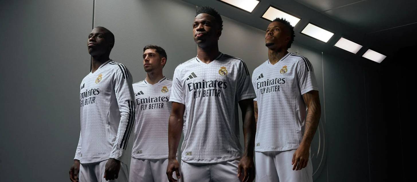 皇家马德里和阿迪达斯发布了2024/25赛季的主场球衣。这次的设计采用了极简风格,白色的球衣上加入了定制的花纹图案,并带有“RM”字样。球衣的细节部分是黑色的,包括赞助商标志、阿迪达斯的标志、肩部的条纹和V领线。 这款球衣以简洁的设计向皇家马德里的DNA致敬,采用最先进的材料制作,并配备了HEAT.RDY技术,可以调节空气流动,在比赛中保持球员的舒适度。