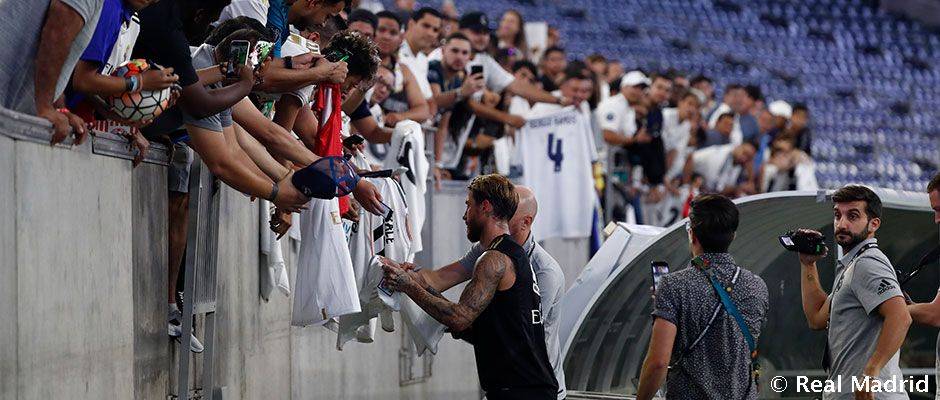 球迷们对于皇马的热情还在继续。在休斯顿NRG体育场结束训练后我们再次感受到了球迷们的爱戴。拉莫斯通过签名与合影的方式向球迷们表达了对他们支持的感谢。