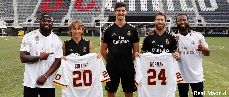 来自NFL华盛顿红皮的橄榄球运动员Josh Norman和Landon Collins参加了皇马在美国首都的训练课。拉莫斯、莫德里奇和库尔图瓦在Audi Field球场与二人会面并互换球衣。FedExField体育场是华盛顿红皮的比赛场地,也将是皇马迎战阿森纳的球场。