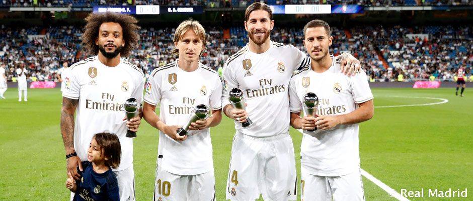 拉莫斯、马塞洛、莫德里奇和阿扎尔在伯纳乌展示了最佳阵容奖杯