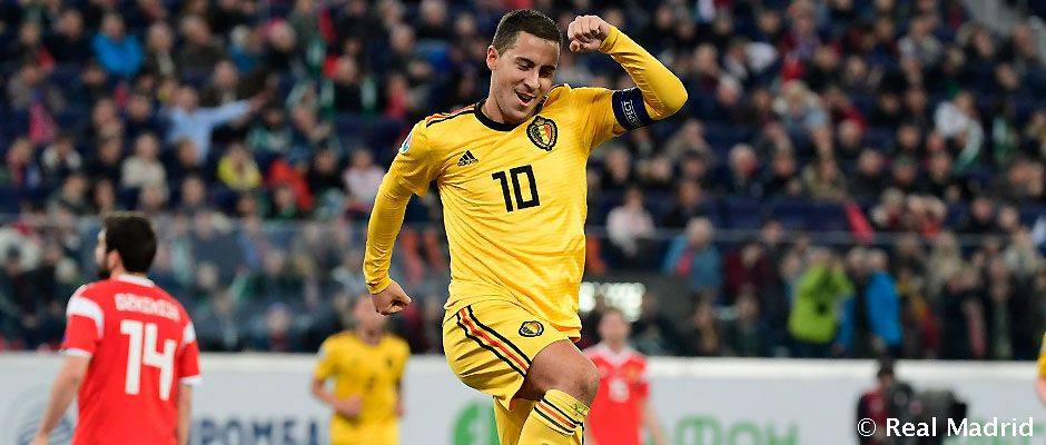 阿扎尔成为了比利时国家队历史第二射手。在比利时4-1击败俄罗斯的欧洲杯预选赛中,皇马前锋贡献两射一传闪耀全场。他在国家队的进球数达到了32粒,超越了保罗·云·希姆斯特和伯纳德·沃尔霍夫(30球),仅次于排名第一的卢卡库(52球)。阿扎尔在为国家队效力了106场后达到了这一成就。在面对俄罗斯,阿扎尔首发并打满90分钟,为队友贡献了一次助攻后,自己也梅开二度。库尔图瓦同样首发踢满了全场。