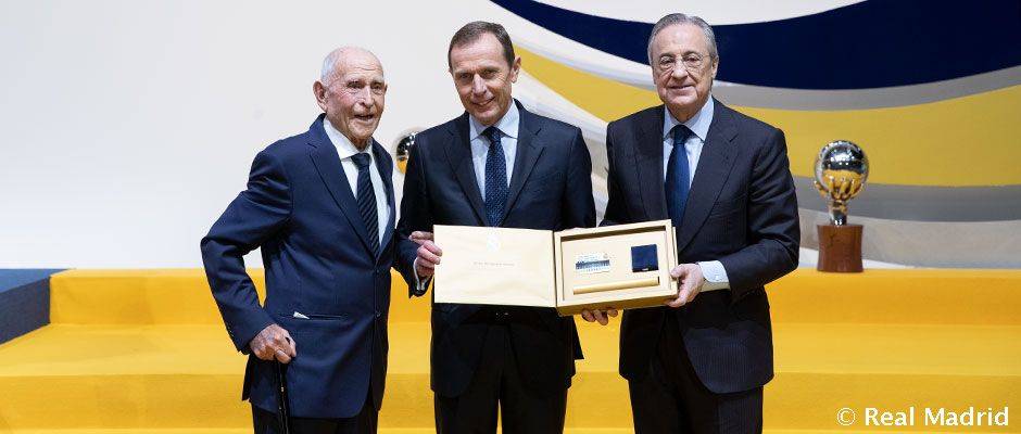 在这个特别的仪式上,弗洛伦蒂诺为布特拉格诺和桑奇斯送上金针勋章。布特拉格诺是皇马一线队的12年会员,为皇马打进171粒进球,桑奇斯则为皇马一线队效力18年之久。已故的奥古斯丁·埃雷林也得到一枚金针,由这位伯纳乌传奇的子女代收。