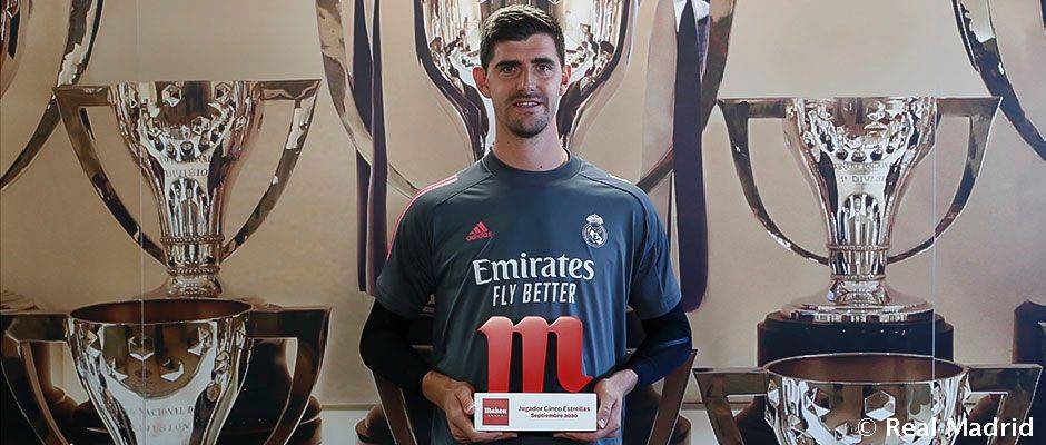 库尔图瓦当选Mahou五星皇马9月最佳球员库尔图瓦获得了Mahou五星颁发的皇马9月最佳球员,比利时人在皇马体育城接受了这一奖杯,这也是对他上个月出色发挥的褒奖。库尔图瓦在9月出战了3场西甲联赛(分别对阵皇家社会、皇家贝蒂斯和巴拉多利德),并且取得了2场零封。