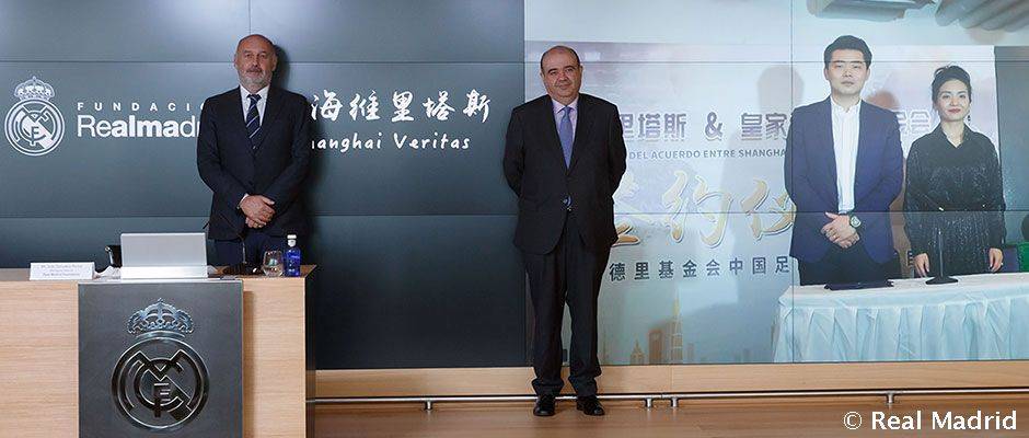 皇家马德里基金会和上海维里塔斯文化发展有限公司签署在中国开展足球及价值观训练营协议皇家马德里基金会总经理胡里奥•冈萨雷斯•隆科先生和传奇球员、皇家马德里基金会中国学校前总监里卡多•加列戈先生,于今天上午,在皇家马德里体育城礼堂与上海维里塔斯文化发展有限公司首席执行官于济源-Dexter Yu先生,远程签署了合作协议。
