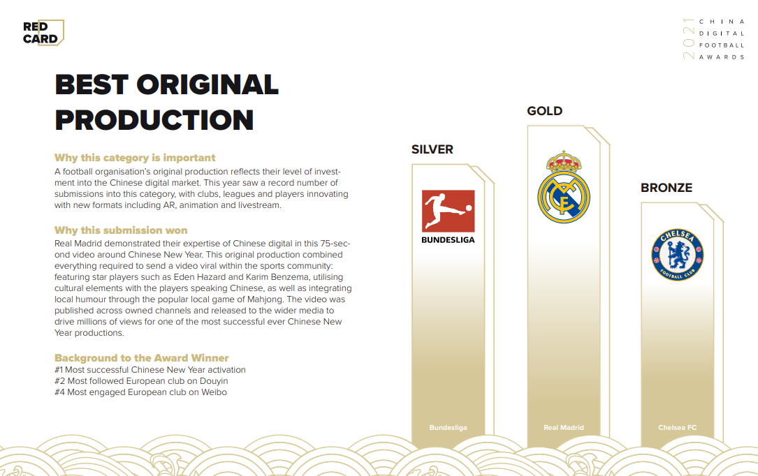 皇马获得Red Card 2021最佳原创内容奖皇家马德里足球俱乐部在2020年中国春节制作发布的原创视频获得了由中国专业体育数字营销机构邮人体育组织评选并颁发的Red Card 2021最佳原创内容奖。