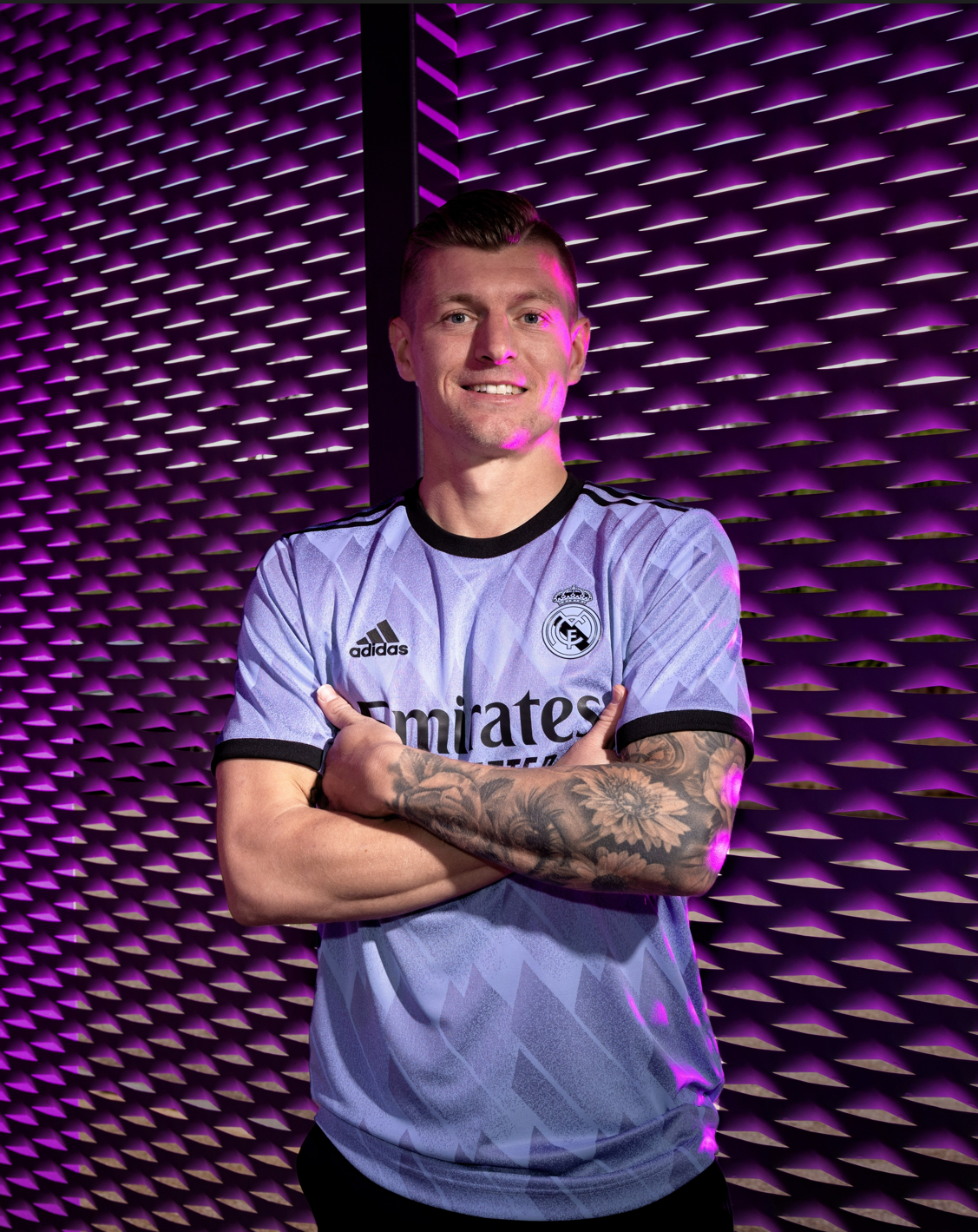 皇马与阿迪达斯共同发布了球队2022/23赛季客场球衣。球衣整体以紫色为主色调,结合阿迪达斯经典的三条纹点缀,领口采用圆领,使用黑色为主色。球衣上的几何图案灵感来自于阿迪达斯90年代球衣的经典设计。7月30日,皇马将在对阵尤文图斯的季前热身赛上身穿这件球衣。