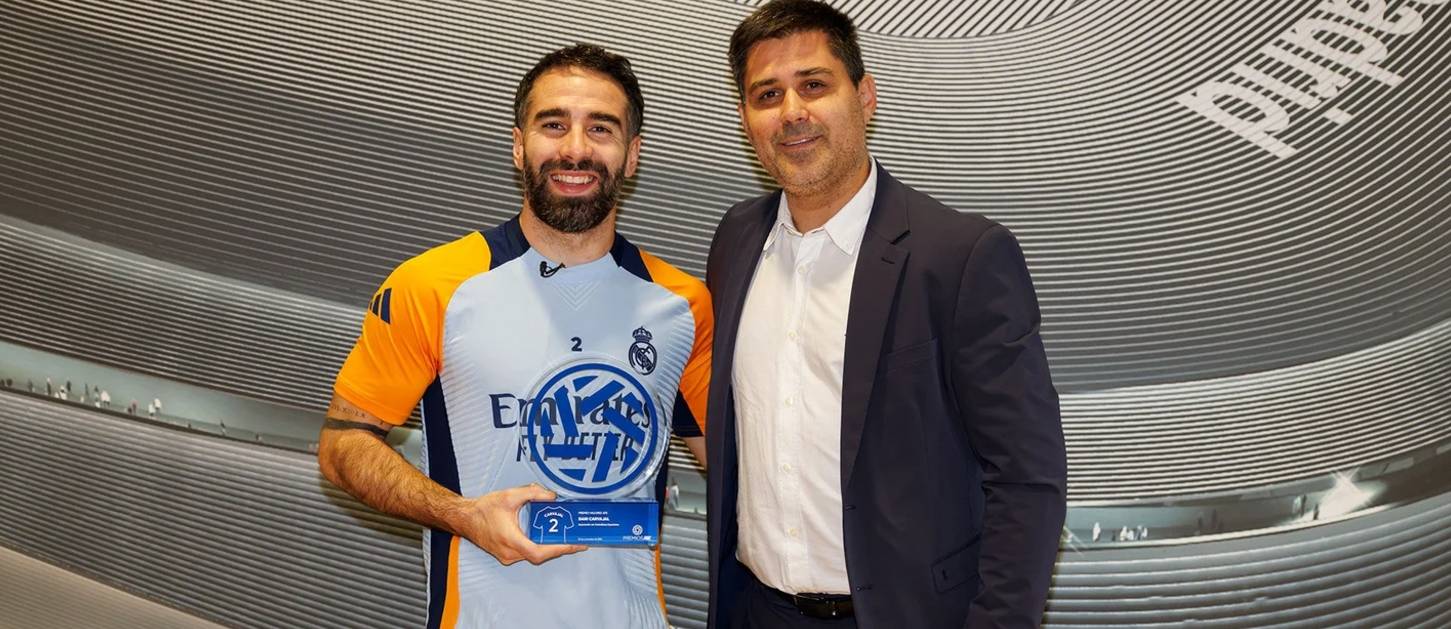 卡瓦哈尔获得AFE最具体育精神奖卡瓦哈尔在西班牙球员工会(AFE)颁奖典礼上荣获“AFE最具体育精神奖”,该颁奖典礼在马德里的拉斯本塔斯斗牛场举行。西班牙球员工会表彰这位皇马球员为“体育精神的完美代表,一位榜样球员,是年轻一代的模范”。在上赛季,卡瓦哈尔随皇家马德里赢得了欧冠、西甲和西班牙超级杯,并随西班牙国家队夺得了欧洲杯冠军。