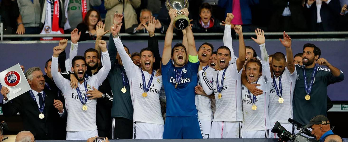 2014年8月12日,在前一个赛季捧起第十座欧冠奖杯后,皇马在威尔士加迪夫再次问鼎洲际赛事,以2比0击败塞维利亚。C罗在比赛中独中两元,并当选全场最佳球员。那场比赛也见证了俱乐部传奇之一托尼·克罗斯的正式首秀。 比赛进行到上半场第30分钟,贝尔左路送出精准传中,C罗抢点破门为皇马首开纪录。下半场,葡萄牙前锋用一记低平斜射锁定胜局。凭借这场胜利,皇马时隔12年再次捧起欧洲超级杯。