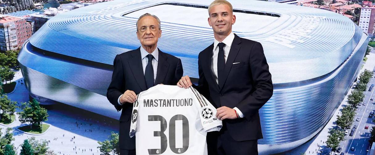马斯坦托诺正式亮相皇马皇家马德里俱乐部在位于马德里的皇马体育城为新援弗朗科·马斯坦托诺举行了亮相仪式。活动现场首先播放了球员的精彩比赛集锦。随后,俱乐部主席弗洛伦蒂诺·佩雷斯发表致辞。他表示:“今天对于所有热爱皇马的人来说都是特别的一天,因为球队迎来了近年来世界足坛最具天赋的年轻球员之一。我们欢迎弗朗科·马斯坦托诺加盟皇家马德里。”