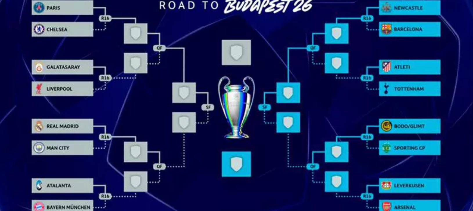欧冠1/8决赛完整对阵如下:皇家马德里对阵曼城,博德闪耀对阵葡萄牙体育,巴黎圣日耳曼对阵切尔西,纽卡斯尔对阵巴塞罗那,加拉塔萨雷对阵利物浦,马德里竞技对阵热刺,亚特兰大对阵拜仁慕尼黑,勒沃库森对阵阿森纳。